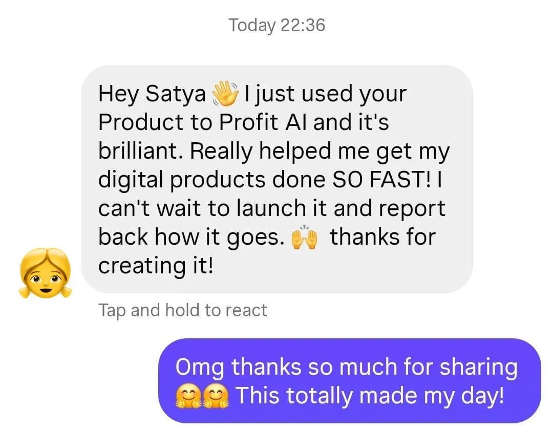 While there's no 1:1 support directly from Satya (on a 1:1 call or via DM) - this AI tool has been trained on Satya's own Viral Digital Products Framework. So every time you have a question - you can ask this tool - and it'll tell you exactly what Satya would say if she was speaking to you herself.
