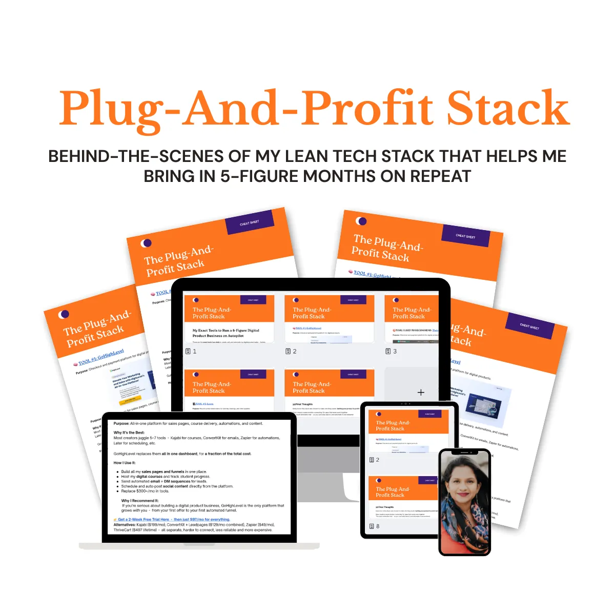 ✅ My exact tech stack and automation tools that run my 6-figure digital product business — so you can skip setup stress, avoid wasting time and money on complicated tools - and start selling NOW.